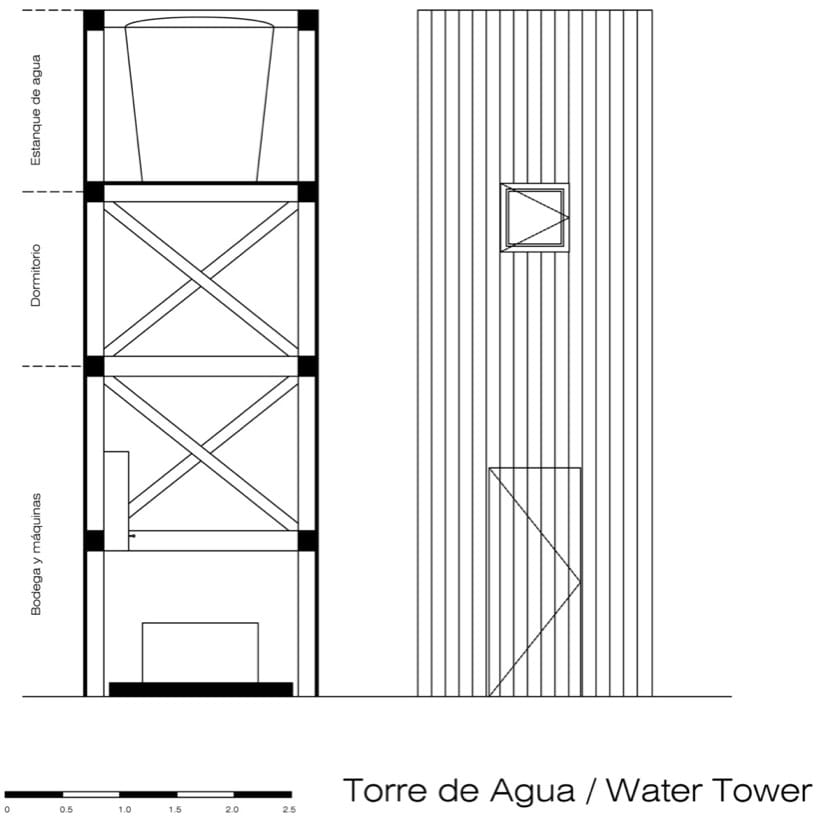 La estructura vertical que forma la torre tiene cuatro plantas. En el piso superior se sitúa un depósito de agua; debajo hay un dormitorio, espacio de almacenaje, y cuarto de instalaciones.