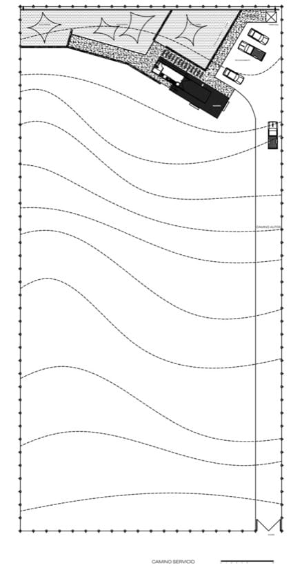 Este proyecto tiene que ver con unas instalaciones de alojamiento rural, próximas a la playa, dentro de una finca de 5.000m2 (IV Región, Chile). Con arena de río había que acondicionar una zona de acampada, delimitada por bajos muros de piedra. El abastecimiento de agua se conseguía con un depósito colocado en una torre. Con un reducido presupuesto había que construir también el espacio común para los huéspedes, consistente en baño y cocina. Por eso se reutilizó un contenedor de 20 pies de longitud, dando lugar a la Habitación Huentelauquén.