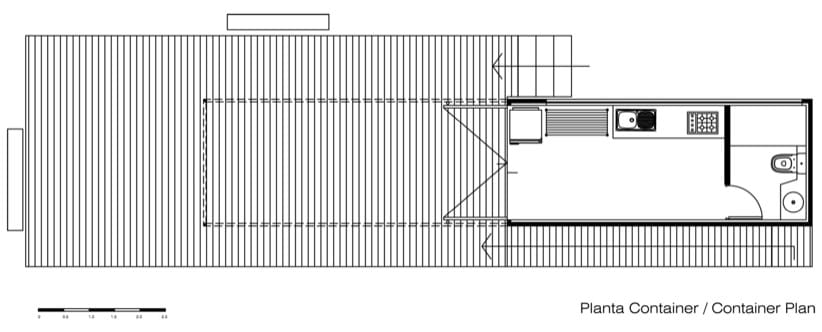 El contenedor está acompañado por un espacio exterior que se puede utilizar como terraza. Es una plataforma de madera, protegida por una ligera estructura con lona, aportándole una buena sombra durante el día.
