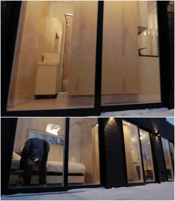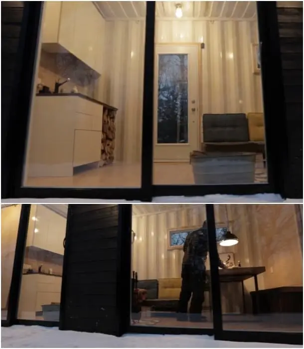 La fachada más soleada de la cabaña está equipada con cinco grandes ventanas, lo que no solo permite un excelente aprovechamiento de la luz natural, sino que también facilita el calentamiento solar pasivo del espacio interior. Este detalle es crucial para mantener una temperatura agradable durante los meses más fríos del año.