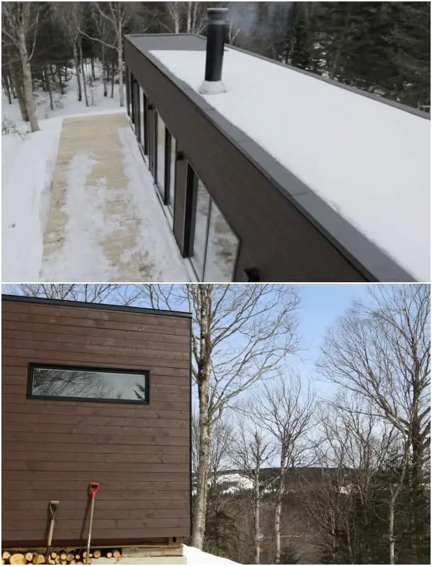 La cabaña contenedor Massif Du Sud está revestida completamente de madera en su exterior, integrándose armoniosamente con el entorno natural. Su interior mantiene el acabado metálico del contenedor original en algunas paredes y el techo. Pero ofrece un ambiente cálido gracias al uso estratégico de la madera en pisos, puertas, y ciertas paredes, incluido el baño.