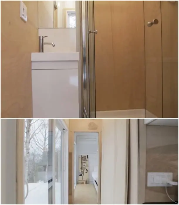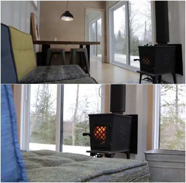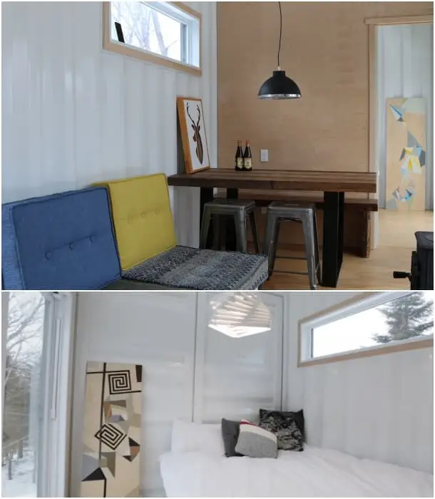 A primera vista, parece que se ha utilizado un contenedor de 40 pies, organizado ingeniosamente para crear una vivienda compacta y acogedora. La distribución incluye dos dormitorios, baño, y un espacio central multifuncional que alberga la cocina, comedor, y sala de estar. Para calentar la cabaña, se utiliza una estufa de leña, añadiendo un toque rústico y eficiente.