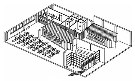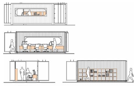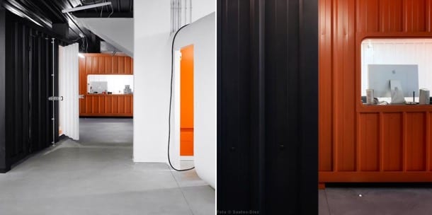 Debido a que estas instalaciones se crearon en un edificio ya existente, y a los reducidos huecos de la fachada, las alteraciones sobre los contenedores se hicieron in situ, con las porciones de los mismos. Se utilizaron los laterales de los contenedores como elementos de partición para definir los espacios. Sin seguir el mismo método, el resultado final es similar al de la casa de 4 contenedores Upcycle Living.
