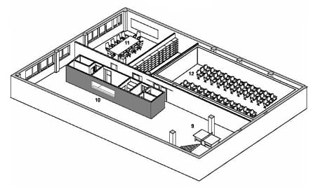 La planta de acceso al recinto se destinó para las oficinas. En el sótano se distribuyeron los usos sociales de la empresa: sala de reuniones, auditorio, cafetería, y sala de exposiciones.