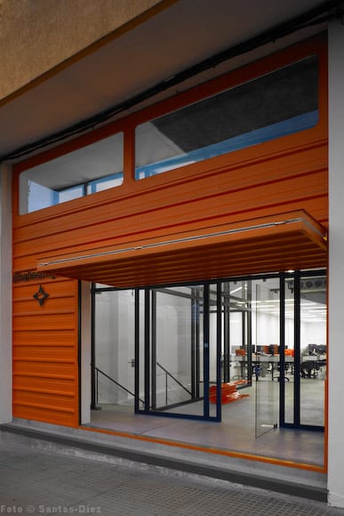 Las fotos y dibujos de este proyecto tienen que ver con una reforma hecha en un edificio de Santiago de Compostela (España). Se modificaron 800m2 de un antiguo gimnasio, distribuidos en dos pisos, para adaptarlos a una empresa de servicios de internet (Dinahosting). Lo verdaderamente interesante aquí es que se trata de una reforma con contenedores de carga. Eso ayudó a conseguir la decoración que se buscaba, y estar en consonancia con la moda de construir con containers.