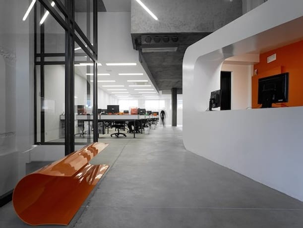 Otras áreas, como la de recepción, fueron creadas con paneles Pladur, pintados en blanco y en naranja de la marca.