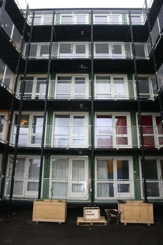 Como se puede ver en las fotos del interior, se trata de apartamentos pequeños, tipo estudio, de 25m2. Tienen espacio multifuncional para comer, cocinar, y dormir, además de un cuarto de baño con ducha. Todo ello está metido en contenedores de transporte de 40 pies de largo. Los trabajos de acondicionamiento se completaron en tan solo 14 semanas, que consistieron en acristalar tanto la parte frontal como la posterior de cada uno de los contenedores. En la cara interior se colocó el material aislante y los paneles de acabado.