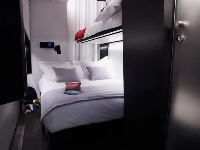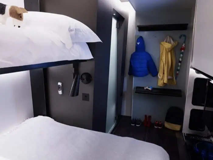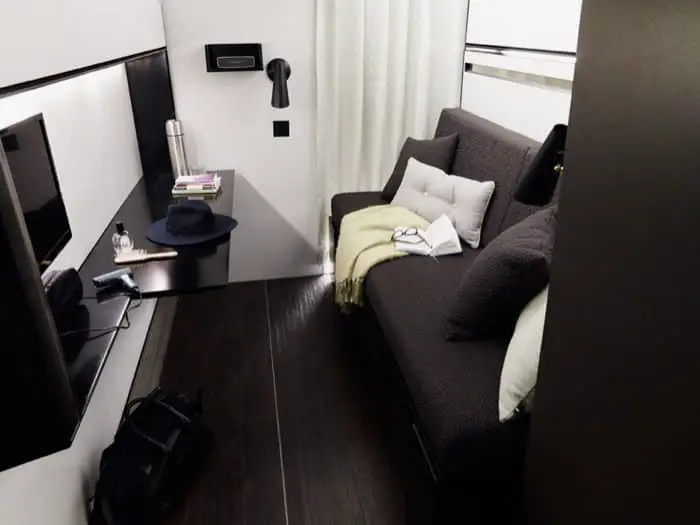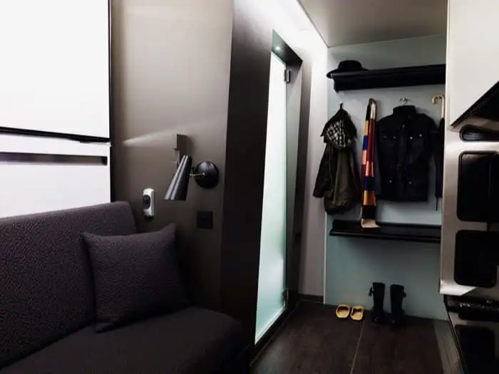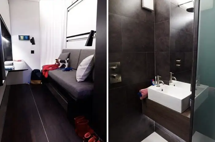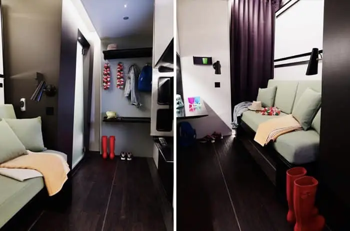 El mayor desafío de todo el proceso tuvo que ver con las camas: tenían que permanecer escondidas cuando no se utilizaban. Cuando el cliente entra por primera vez en la habitación, lo único que ve es un sofá y un escritorio. A la hora de dormir, es suficiente tirar para desplegar las camas, permitiendo diferentes configuraciones, según la cantidad de personas. El cuarto de baño ha sido diseñado como uno de lujo, con bastante libertad de movimiento, y con la posibilidad de colgar toallas y ropa para secar. El nuevo diseño del hotel viene en tres acabados diferentes: Industrial Chic, Neutral Couture, y Fresh Perspective.