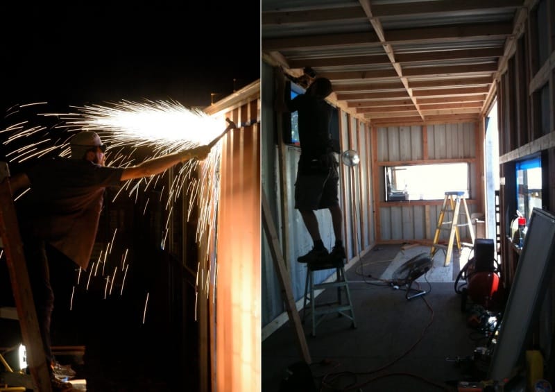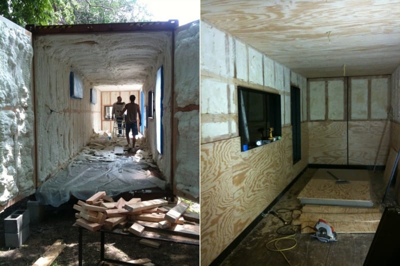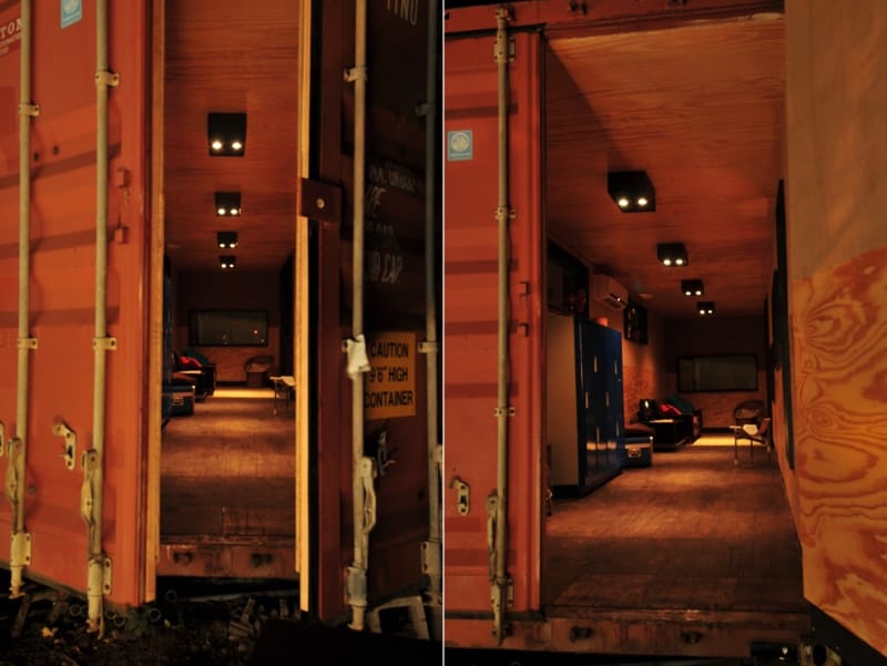 La puerta corredera de entrada y las ventanas, le dan al estudio una buena iluminación natural durante el día. Esos huecos sobre la chapa se abrieron con cortadoras de plasma. El interior se roció con espuma a base de soja, con el fin de aporta una capa de material aislante. Finalmente se revistió el interior con paneles de madera contrachapada, un recurso bastante habitual cuando se trata de contenedores transformados. También se utilizó en determinadas áreas papel reciclado Homasote.