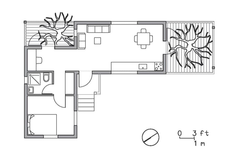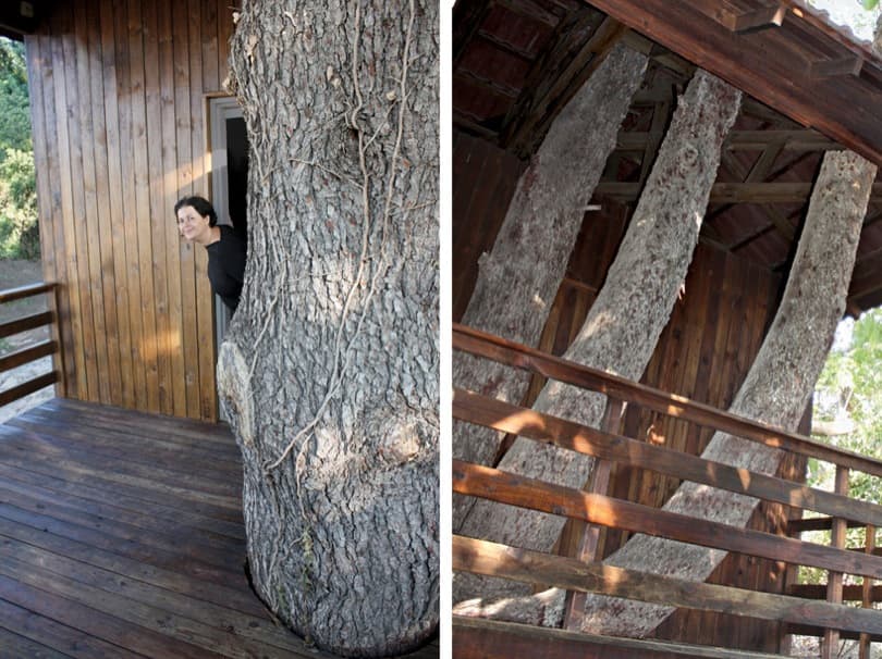 Justo en el sitio idóneo para colocar esta cabaña, había dos pinos maduros. Como además el sitio era estrecho, se decidió que esos dos árboles formarían de alguna manera parte del proyecto. Esa arriesgada decisión hizo que Two-Tree House adquiriera un ambiente muy especial.