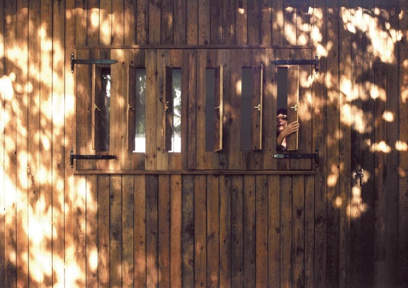 Una vez transportada la casa y puesta en el sitio, se le añadió el revestimiento de madera de las fachadas. También se completó la cubierta a dos aguas, y ciertos trabajos con la piedra. El resultado final es el de una cabaña entre dos árboles, sin indicio alguno de que su estructura sea de contenedores reciclados.