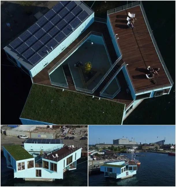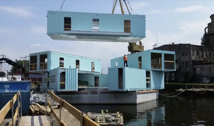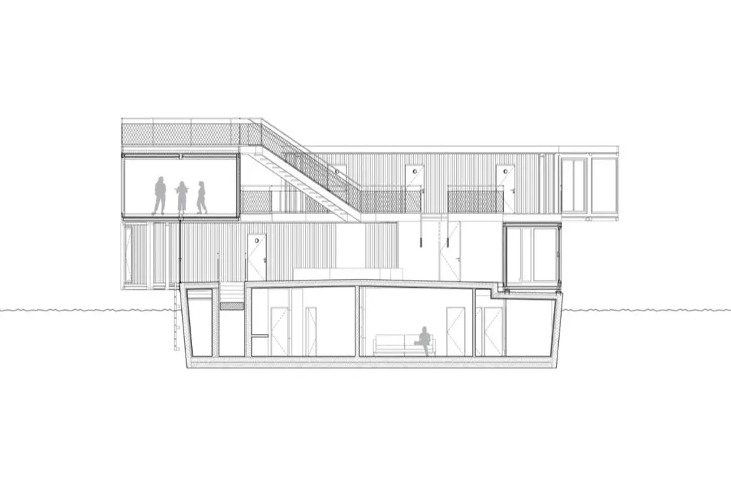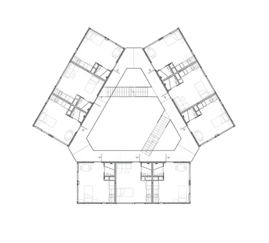 El diseño utiliza nueve contenedores de 40 pies, montados sobre una plataforma flotante. En la planta baja, tres contenedores están dispuestos en forma de triángulo equilátero. Los seis restantes, emparejados y apilados sobre los primeros, forman otro triángulo invertido. Esta disposición crea un total de 15 apartamentos compactos, organizados alrededor de un patio central que sirve como área común protegida.