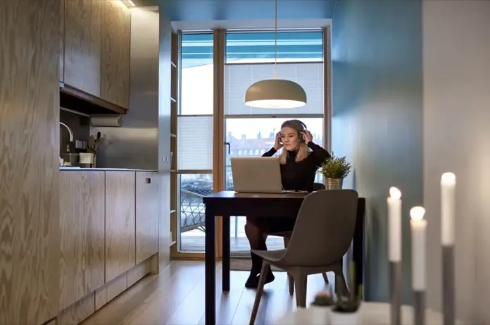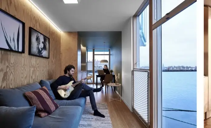 Cada apartamento es un estudio con zonas multifuncionales, baño, y cocina, optimizando el espacio limitado. En las imágenes del proyecto, se observa una galería superior que permite el acceso a los estudios superiores mediante una escalera externa. Además, existe otra escalera que conduce a una terraza comunitaria. Otras áreas incluyen una terraza cubierta de césped y otra equipada con paneles solares, subrayando el compromiso del proyecto con la sostenibilidad.