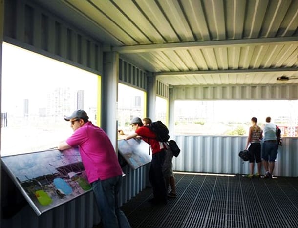La estructura que aparece en estas fotos lleva el nombre de View Tube. Se construyó en una posición elevada, dentro del Queen Elizabeth Olympic Park de Londres. El edificio funciona como cafetería, mirador, y galería de arte. Es un punto de reunión de muchos runners y ciclistas de la zona. Pero lo que más nos interesa de este proyecto es que está hecho con contenedores de carga, y es sostenible.