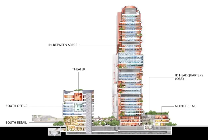 — Torre Este: 188 metros, es sede principal de JD.com. Pero también tendrá niveles inferiores de carácter más público, para eventos culturales.