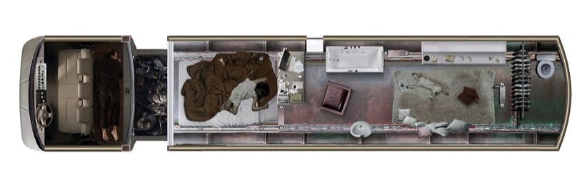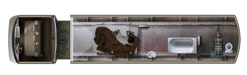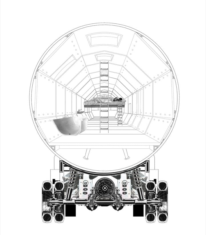 Centrándonos en el tanque cisterna, para hacerlo habitable habría que abrir determinados huecos en el depósito. Uno de ellos podría estar en el frontal del lado de la cabina, formando una gran ventana circular. Lógicamente habría que añadir una plataforma que sirviera de piso, al tiempo que se deja una altura libre suficiente. Cabría la posibilidad de incluir una segunda plataforma, a media altura, para colocar un altillo para dormir. Debajo se puede utilizar como espacio de almacenamiento.