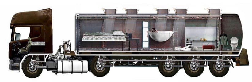 Los contenedores de carga encontraron un lugar en la Arquitectura. Teniendo en cuenta ese éxito, es posible que algo parecido pudiera ocurrir con los tanques de camiones cisterna. Esta idea surge aplicando el mismo objetivo: reutilizar un elemento que ya ha cumplido su ciclo de uso habitual. Por tanto, estos tanques también se podrían adaptar, consiguiendo espacios habitables. Pero aquí encontraríamos un plus añadido: el de la movilidad. Sería sencillo de conseguir, pues solo habría que mantener la vinculación con el camión. De esta manera llegamos al concepto de Apartamentos KEG, que no es otra cosa que refugios móviles en camiones cisterna.