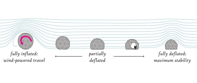 El refugio Arctic Drifter tiene una compleja estructura esférica, que está rodeada de bolsas de aire Hypalon. Es un material que se suele emplear en numerosas embarcaciones inflables. Cuando todos sus módulos están llenos de aire, el refugio alcanza un diámetros de 15 metros. Entonces es capaz de moverse por casi cualquier superficie llana, y bajo condiciones meteorológicas extremas. Esta cualidad de Arctic Drifter evita que los investigadores tengan que caminar largas distancias, sobre todo cuando hace mal tiempo.