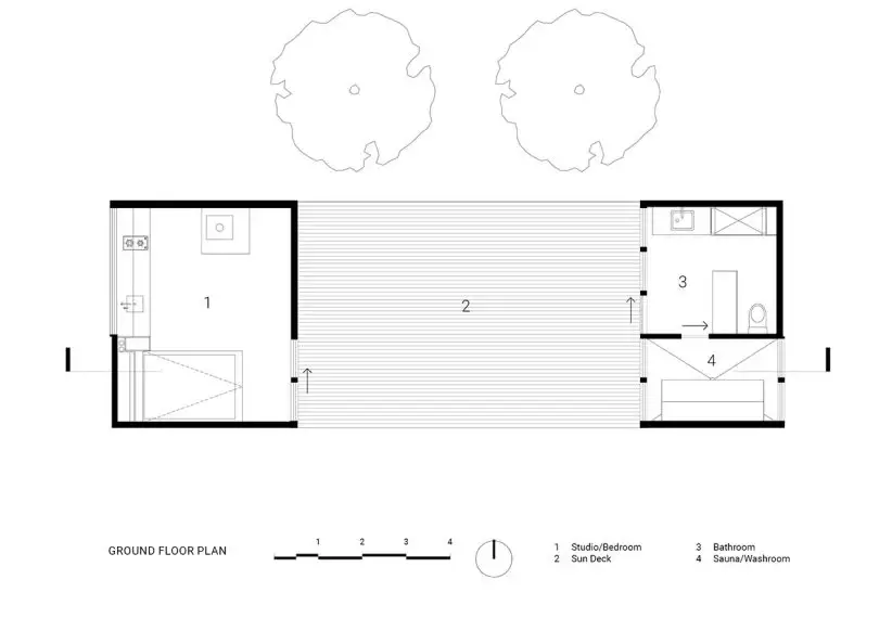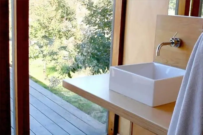El Bath House se erige sobre una plataforma rectangular utilizando el innovador sistema prefabricado ARKit, que optimiza tiempos y reduce el impacto ambiental durante la construcción. Los componentes prefabricados ARKit sirven para conformar paredes, techo, y suelo. Forman un panel integrado que combina revestimiento exterior de cedro rojo occidental, aislamiento, y revestimiento interior. De esa manera se crea una envolvente de alto rendimiento. La madera robusta del exterior se integra estéticamente con el entorno natural.