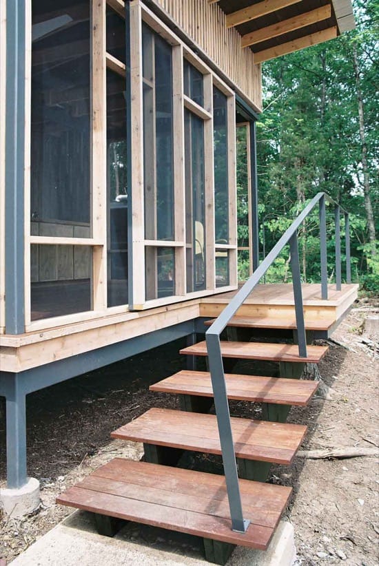 Por su durabilidad y facilidad de fabricación, los arquitectos eligieron una estructura de acero (también conocida como steel frame). Sobre ella se fijaría la “piel” del refugio, que está compuesta por carpintería de madera con paneles correderos (en el porche), y fijos en el resto. Hay tablones verticales de cedro, de 2×4 pulgadas de sección, con malla mosquitera, con el fin de dotar de ventilación pasiva al espacio. Esta disposición de la madera aporta al refugio Cabo Russell de cierto camuflaje en el entorno tan arbolado.