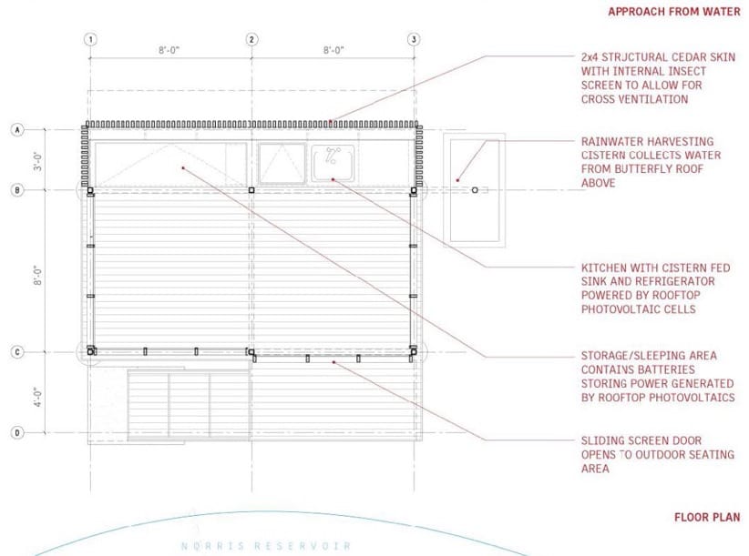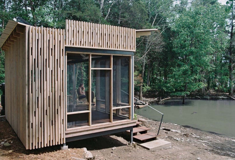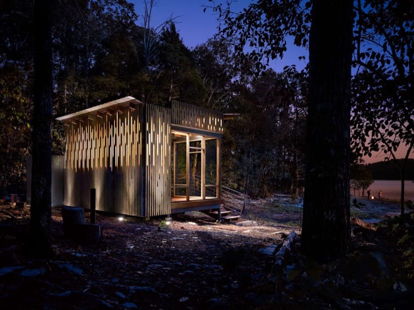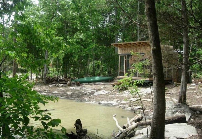Esta construcción surgió con motivo de un encargo para diseñar un retiro al borde de un lago. Se trata del refugio Cabo Russell (Cape Russell Retreat), que debía utilizarse durante los fines de semana, y estar “desconectado de las redes“. Esta exigencia hizo necesaria la recuperación y almacenamiento de las aguas pluviales, así como una instalación fotovoltaica. Un proyecto de estas características no podía faltar en nuestro blog, por eso se incorporó al grupo de refugios desenchufados.