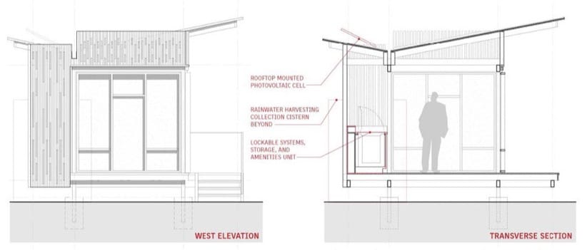 Se eligió la cubierta de mariposa para facilitar la recogida de las aguas pluviales. Para el almacenamiento de esas aguas hay un depósito exterior de 400 galones (1.514 litros). Los paneles fotovoltaicos están en cubierta, y la energía se almacena en baterías ocultas bajo el mueble de la cocina.