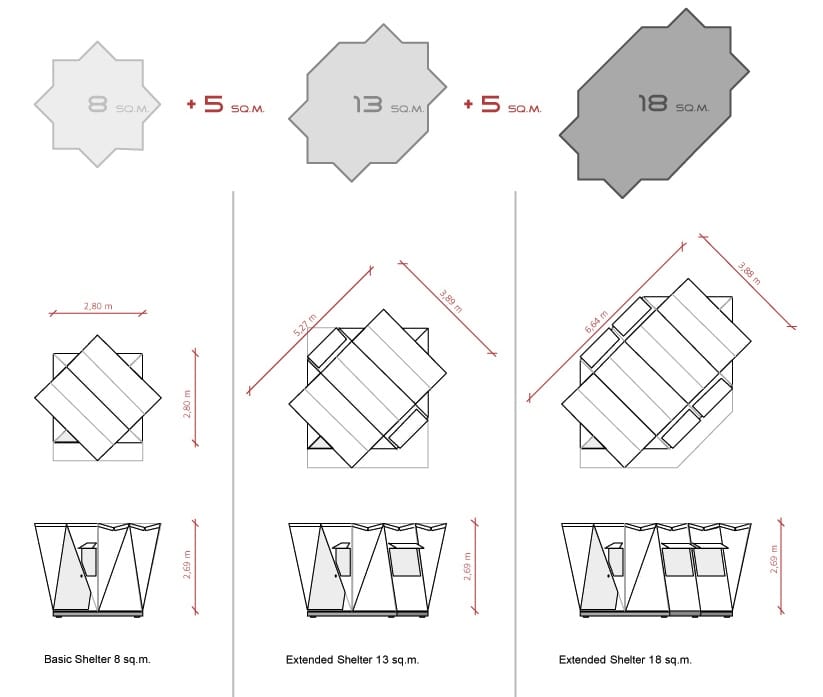 Cada refugio Fold Flat tiene una superficie útil de 8m2, pero puede ampliarse a módulos de mayor tamaño. Es posible obtener refugios de 13 y 18m2, todos ellos montados sobre una sencilla base.