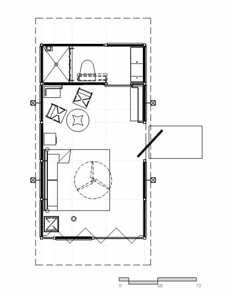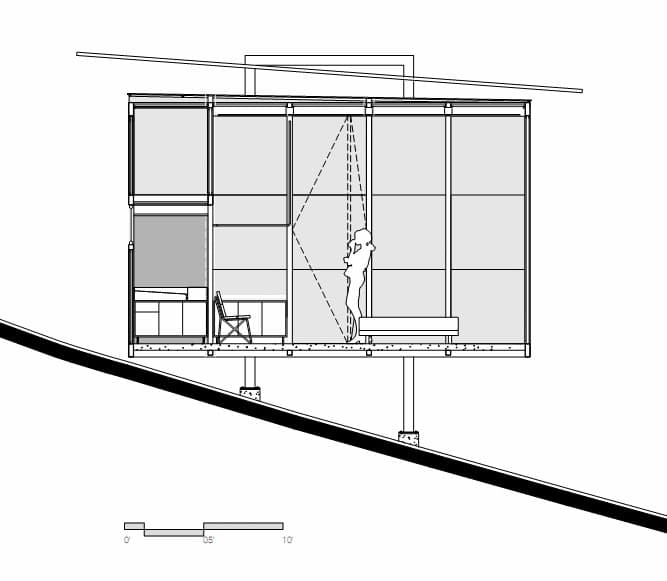 Cada refugio (llamado EcoLoft) tiene veinte metros cuadrados de superficie. Su estructura metálica (acero corten) queda parcialmente vista. En el exterior se ha empleado revestimiento de madera, y un inesperado acabado de lujo dentro. Algunos están decorados en tonos oscuros (paredes en negro), y otros en blanco. Su organización no se llega a apreciar bien en las imágenes, para eso es preciso mirar el plano de planta. Cada habitación tiene cuarto de baño, y terraza en la entrada para disfrutar de la vida en el campo.