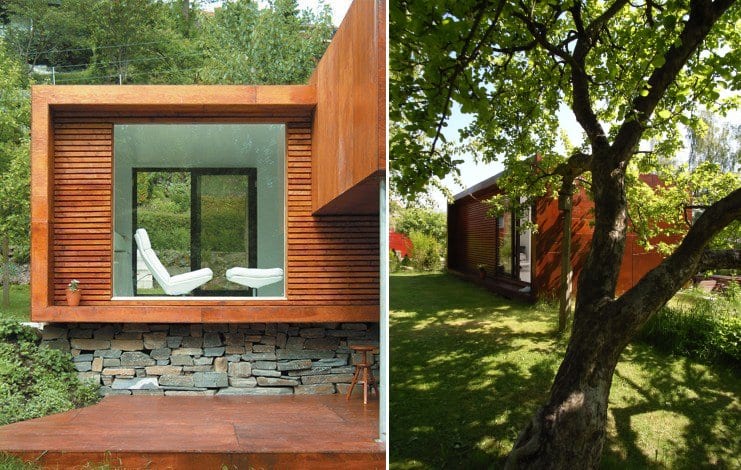 Kolonihagen es una pequeña construcción que está en Stavanger (costa oeste de Noruega). Tiene apenas 24m2, pero a pesar de tan reducido tamaño, el arquitecto supo encajar dos volúmenes sencillos. En ellos adaptó un reducido programa de alojamiento de verano, a modo de refugio para dos personas. Y por si eso fuera poco, además resolvió un desnivel del terreno (de casi 1 metro).