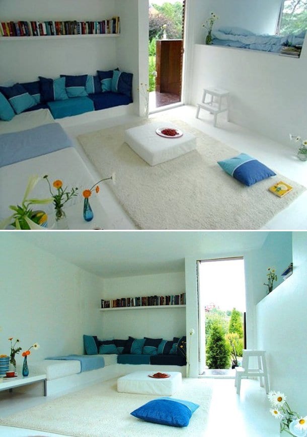 El interior del refugio Kolonihagen también es sencillo, y de un estilo marcadamente minimalista. Para evitar que los muebles rompan con ese equilibrio, se creó con la arquitectura la superficie de trabajo de la cocina. Algo similar se hizo con los asientos que hay en la sala. Un grupo de cojines en tonos azulados se encargan de aportar el confort necesario.