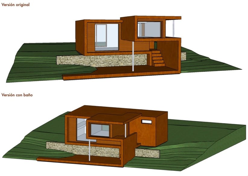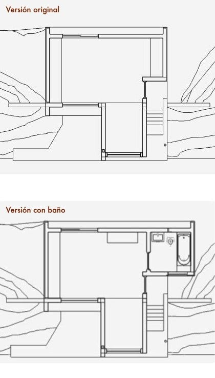 La versión original de este refugio no tenía baño, pero posteriormente se le añadió, según se ve reflejado en los planos y dibujos 3D.