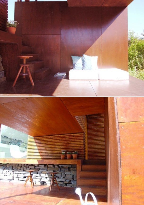 Por dentro predomina un acabado liso y blanco. La fachada está revestida con paneles de madera, que alternan con franjas horizontales de listones. Una puerta corredera de dos hojas da acceso desde la cota superior del sitio.