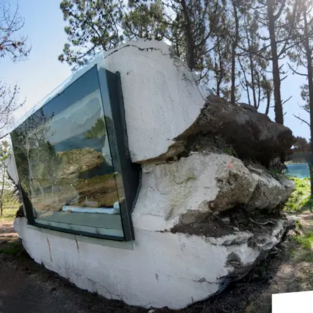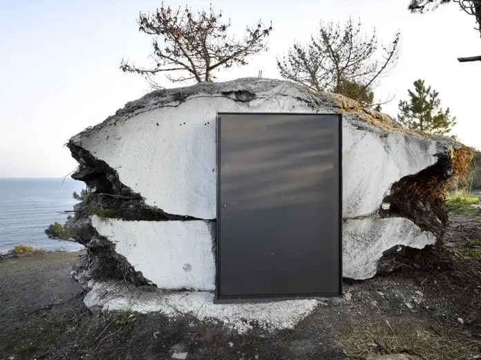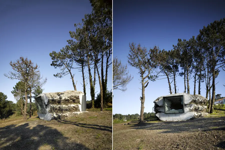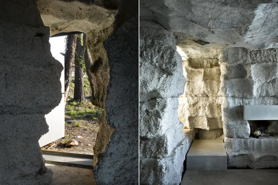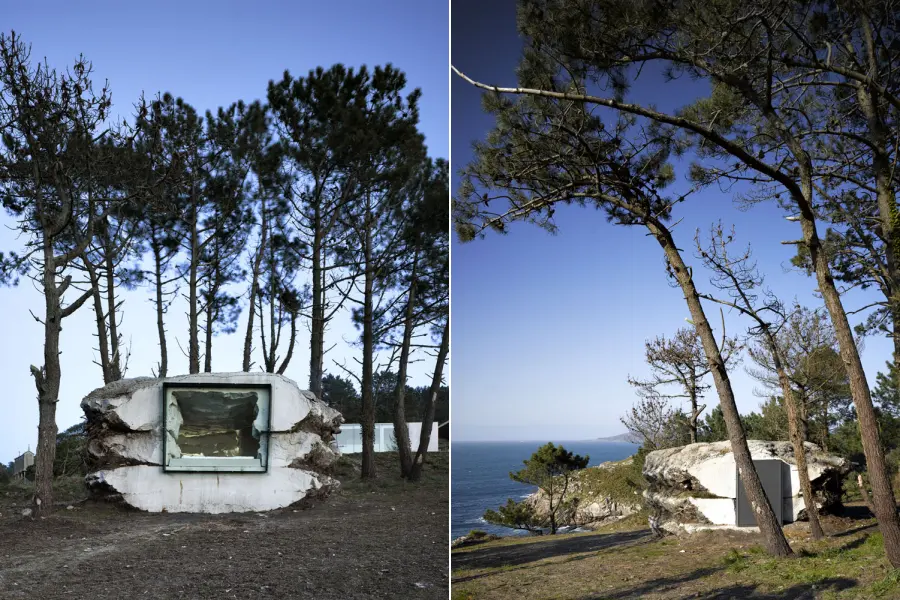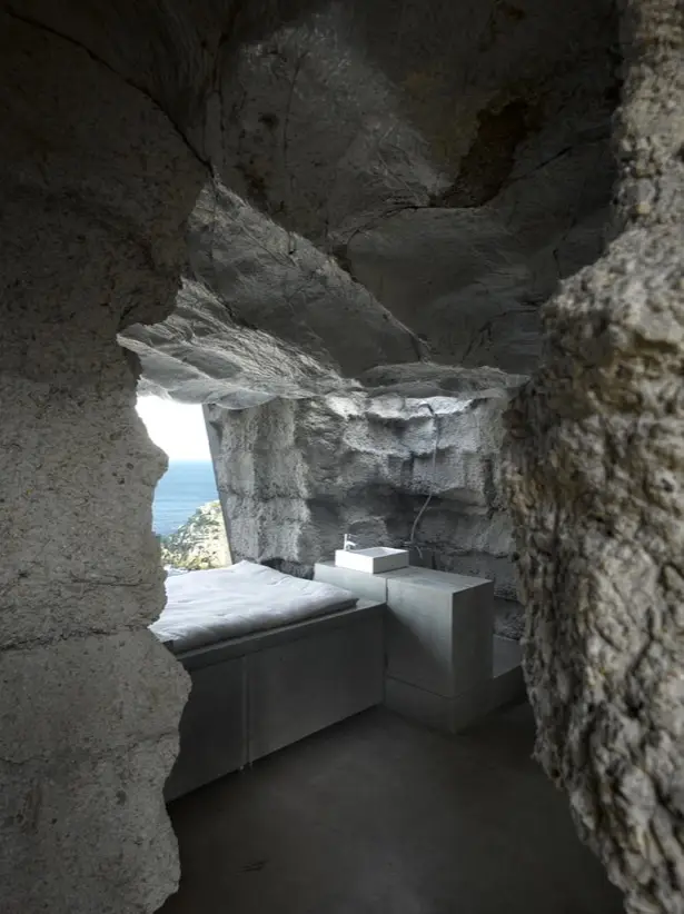 Haría falta poner alguna pantalla que evitara que el agua de la ducha salpicara a la cama. Y añadirle alguna fuente de energía renovable que recuperara la huella de carbono del hormigón masa utilizado. Eso sí, el exterior es perfecto, se integra con el paisaje de la misma manera que una roca.