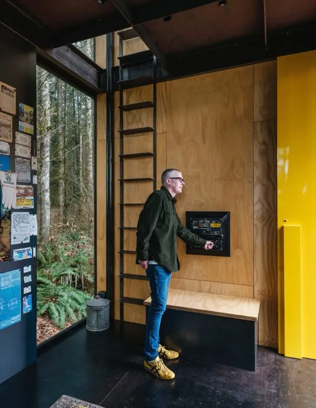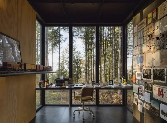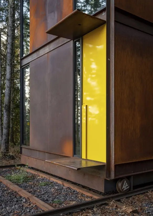 La inspiración para el diseño del Maxon Studio proviene de la rica historia ferroviaria de la región. Esto se refleja no solo en la estructura montada sobre raíles, sino también en otros detalles. Tal es el caso de la puerta pintada con los colores originales de los trenes Great Northern. O el panel de control reutilizado de una locomotora Burlington Northern. El uso de madera contrachapada, comúnmente empleada en los vagones de tren, y las auténticas maderas de ferrocarril recicladas, refuerzan esta conexión temática. Como se puede apreciar, este refugio es una mezcla de referencias ferroviarias y materiales contemporáneos. Esto hace del Maxon Studio un ejemplo único de cómo la arquitectura puede reinterpretar y homenajear el pasado. Y todo ello mientras se integra funcionalmente en el presente.