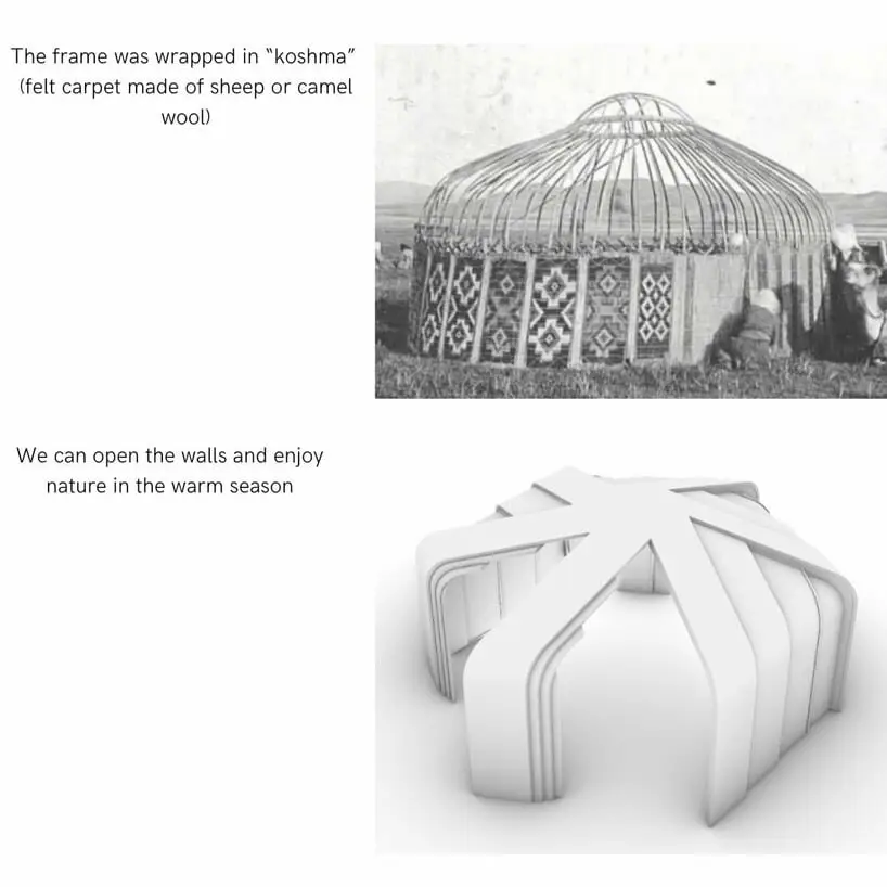 La yurta moderna utiliza elementos volumétricos telescópicos que se asemejan a la imagen típica de una yurta tradicional. Estos elementos permiten que la estructura se adapte a las áreas de estepa mediante la extensión y el cambio de segmentos, creando un espacio habitable cerrado o abierto según las condiciones climáticas. Para minimizar el impacto ambiental, el equipo de diseño ha incorporado un sistema biológico autónomo para el tratamiento de aguas residuales. De esa manera se garantiza la sostenibilidad ecológica del proyecto.