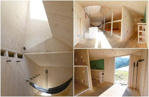 Los arquitectos se lo tomaron como si de un ‘faro en las montañas’ se tratara. Se utilizó como material base el tablero de madera contralaminada (CLT – cross laminated timber). Lo eligieron por sus buenas capacidades mecánicas, y consideraron una sobrecargada de nieve de 2 toneladas por metro cuadrado. El tablero CLT también resultó ser una buena opción como acabado interior, pues ayudó a conseguir el agradable aspecto que se pretendía. En la estructura del refugio Caltun también hay elementos de acero.