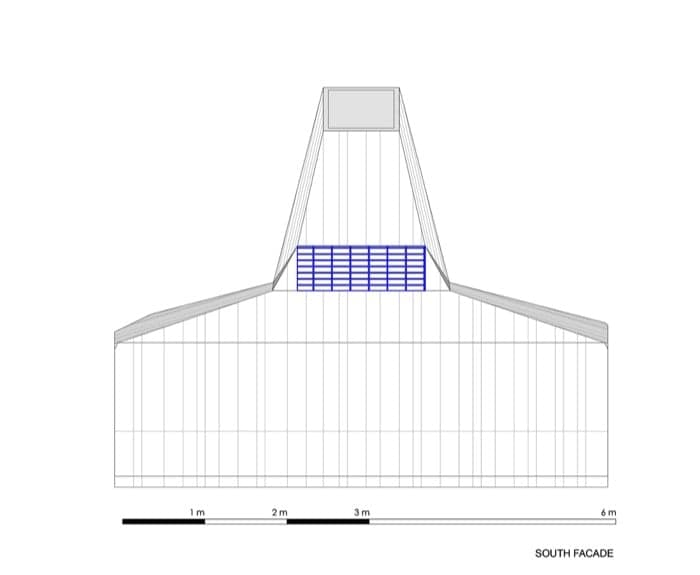 Su forma tan dinámica (ver plano de sección) pretende ser una respuesta a los fuertes vientos dominantes. La cubierta de aluminio toma su color de las piedras con musgo que hay en el lugar.
