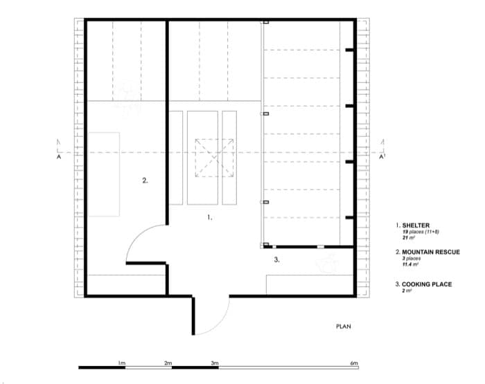 Este refugio alpino está organizado según una planta cuadrada que tiene tres dependencias principales. Hay una habitación (11.4m2) para primeros auxilios del equipo de rescate; un espacio más grande (21m2) con capacidad para 19 montañeros (o turistas); y un pequeño espacio para cocinar de 2m2.