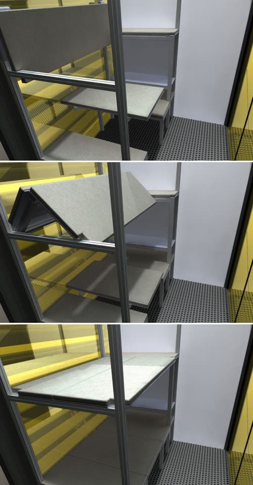 Todo el interior está formado por una ligera estructura de perfiles de aluminio. Como se puede ver en las imágenes, posee elementos convertibles para diferentes posiciones de uso. Caben cuatro personas en camas literas, y se puede configurar el espacio para que parte del refugio se pueda utilizar como escritorio.