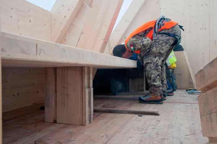 Este refugio prefabricado de montaña se construyó utilizando una estructura modular de madera. Para llevarla a cabo se emplearon paneles de abeto ‘x-lam’ y vigas de madera laminada, todas ellas cortadas con tecnología CNC.
