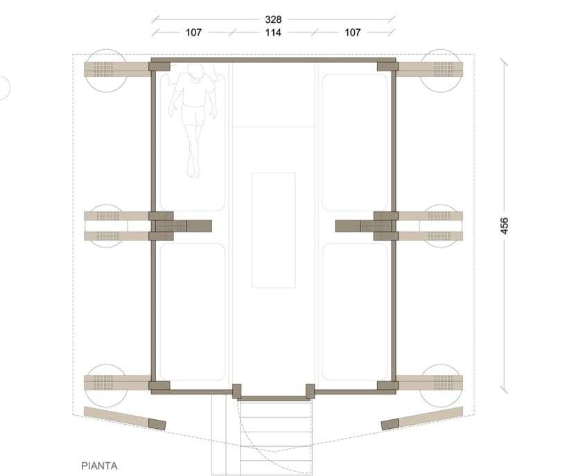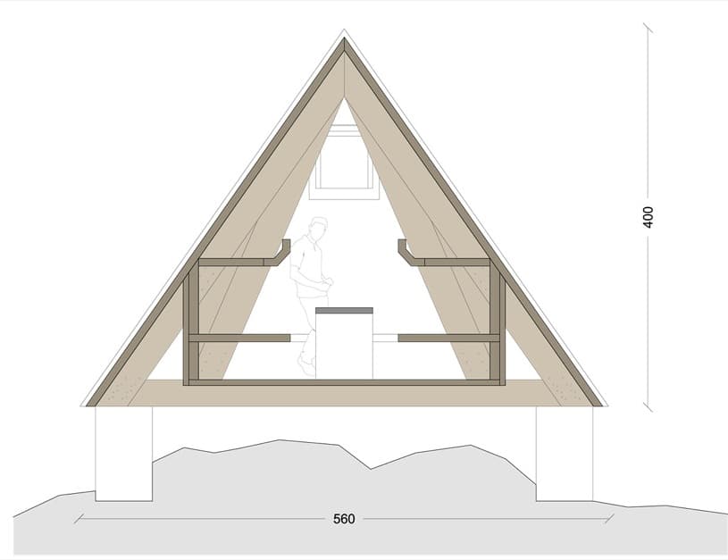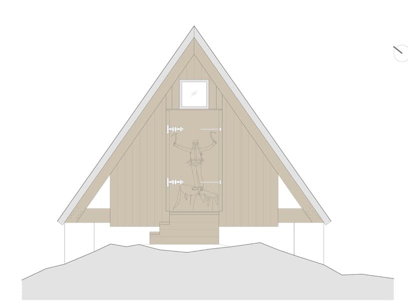 El tamaño de este refugio de montaña es tan solo de 16m2, y su diseño muy simple. Se caracteriza por un tejado a dos aguas, de cubierta bastante inclinada, que está terminado con paneles de cinc. La fachada de entrada queda revestida de madera, y solo hay dos pequeñas ventanas, situadas en fachadas opuestas. Por su reducido tamaño, solo tiene capacidad para que puedan dormir nueve montañeros. Como se puede ver en el plano de sección, unos gruesos tablones laterales forman unas literas. Para que se pueda utilizarse como mesa, se ha colocado un tablero de madera en la zona central. Aunque sea bastante pequeño, todo el interior del refugio se ve confortable, pues está acabado en madera.