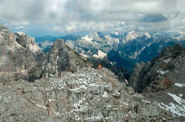 Estas fotos son del refugio prefabricado Luca Vuerich, llamado así en memoria del famoso escalador y fotógrafo italiano. Está ubicado a 2.531 metros de altitud, en lo alto del Foronon del Buinz, una cima de los Alpes Julianos (Italia). La construcción de esta pequeña estructura se realizó en un tiempo récord por un reducido número de personas. Fue encargado por la familia de Vuerich y la asociación de Rescate de Montaña Cave Predil.