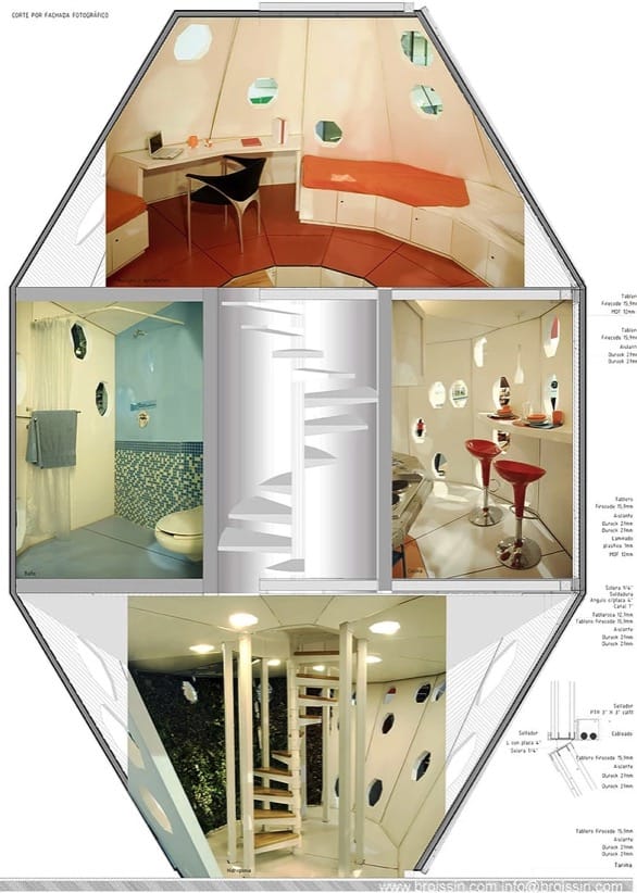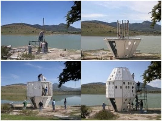 Estas imágenes corresponden al prototipo de un POD pensado para servir de refugio. Su producción tiene un bajo costo, y además se realiza en un corto periodo de tiempo. Por sus características, podría incluso servir para mejorar las condiciones de vida de familias desfavorecidas. Se trata del refugio Shelter 02 de tres pisos, que se construyó por primera vez durante una exposición en el 2008. Más tarde se le concedió un espacio en la Hacienda de la Concepción (Tepotzotlán, México).