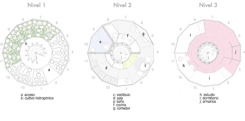 El nivel 1 está despejado, aunque en realidad es un espacio para hidroponía, con las especies vegetales cultivadas en las paredes inclinadas del refugio. En el nivel 2 está la cocina, zona de comedor, sala de estar, y cuarto de baño con ducha. Todas las funciones están dispuestas en serie, alrededor de la escalera. Este piso tiene todas sus paredes verticales, es más amplio, por eso se ha utilizado también la envolvente del hueco de escalera para adosar sobre ella parte de los muebles. En el nivel 3 hay un área para un dormitorio con dos camas, escritorio, y varios armarios.