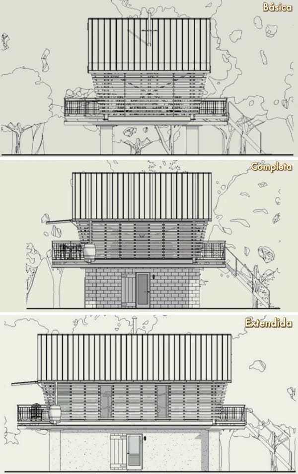- Básica. Es la versión más pequeña (16,25m2) de todas. Posee un espacio de terraza de 12m2. La habitación está colocada sobre cuatro pilotes, y no tiene ni baño ni cocina. Es la que aparece en estas fotos y vídeos.
