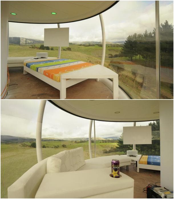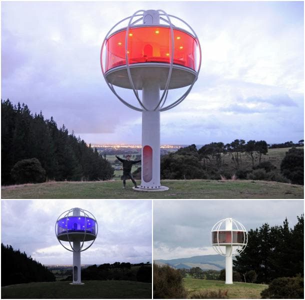 En un principio, la intención era hacer alguna estructura entre varios árboles, pero viendo que eso podría acabar dañándolos, se optó por diseñar un espacio que estuviera apoyado por un único soporte de acero. También era preciso que se pudiera anclar a cualquier lugar, es decir tanto en una colina, como un bosque, o en el mar… Esta torre con refugio está en Linton (isla norte de Nueva Zelanda).