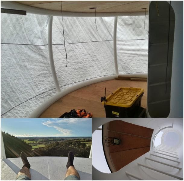 Para explicar la utilidad de Skysphere hay que empezar diciendo lo que no es. No es una torre de control aéreo, ni un puesto de vigilancia forestal, tampoco se trata de una vivienda. Ni siquiera es una casita en los árboles, ya que posee una estructura portante propia. Se trata de un refugio circular autoconstruido por el diseñador gráfico e ingeniero mecánico Jono Williams.