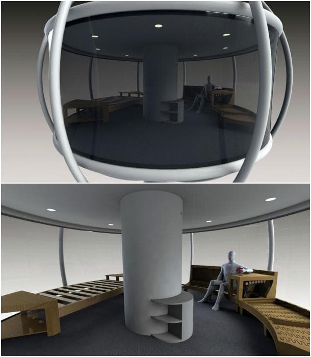 Todos los muebles del interior fueron diseñados a medida. Eso hace que Skysphere sea un lugar bastante especial, y que su superficie esté muy bien aprovechada, ya sea durante las veladas familiares, o para dormir. Esta versión no dispone de cuarto de baño, ni de instalación de fontanería alguna, pero es posible que existan próximos modelos que sí lo tengan, incluso con ascensor.
