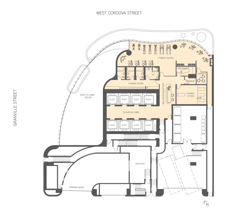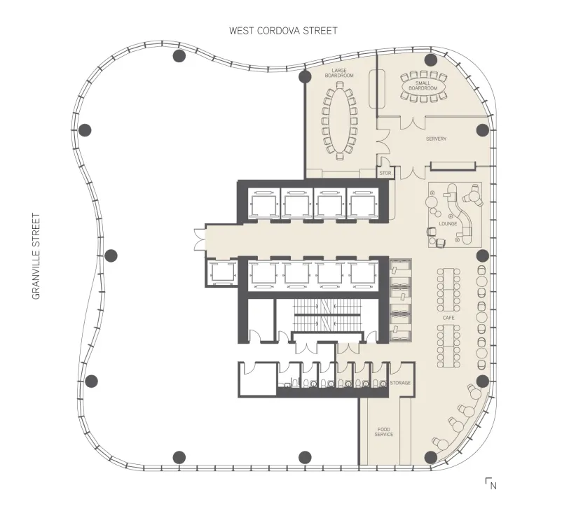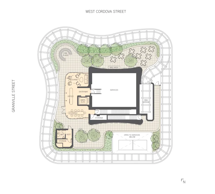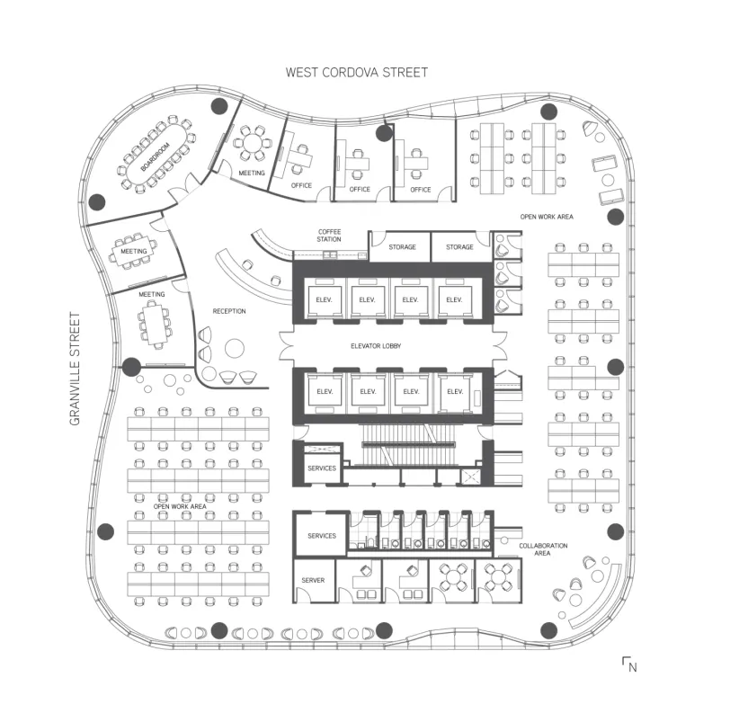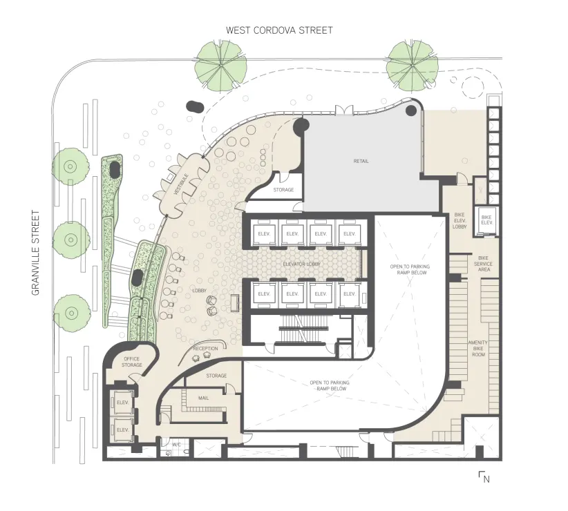 A nivel de calle, la torre presenta una entrada rodeada de columnas que sostienen los voladizos de los pisos superiores. Este diseño protege a los transeúntes de los lluviosos inviernos de Vancouver. Pero también contribuye a la vibrante vida callejera con espacios como una cafetería abierta al público, y áreas accesibles a través del muro cortina de vidrio de doble altura.