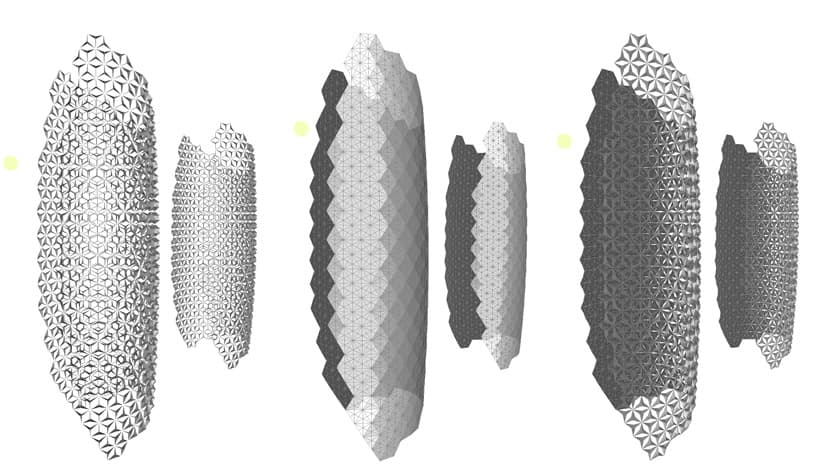 Esta protección tiene un diseño modular triangular que recuerda a la celosía presente en la arquitectura tradicional árabe (mashrabiya). Pero en esta ocasión está dotada de una tecnología capaz de actuar como barrera solar dinámica. Para ello utiliza 1.000 elementos que se pliegan según la posición del sol, controlando el paso de la luz natural.